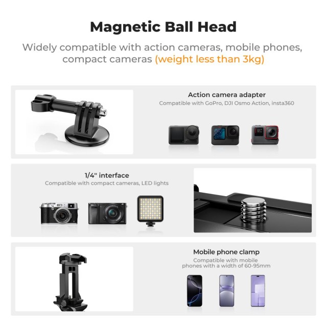 multifunkční autonomní design 2 v 1 se třemi formami rozhraní. Jednodílný skrytý držák na mobilní telefon, který se rozkládá jako univerzální držák na mobilní telefon a po uložení lze přímo připevnit na fotoaparát. Splňuje požadavky na lehká mikro-jednotná zařízení, kapesní světla a další zařízení.