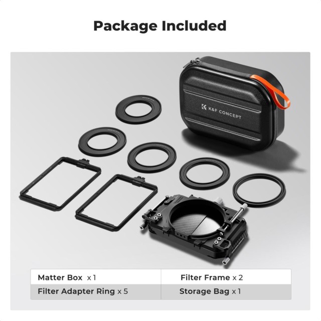 Sada matte boxu se 2 rámečky objektivu a adaptérem 67/72/77/82/95 mm, vhodná pro čtvercové filtry 4x5,65". Matná skříňka Pro je určena pro bezzrcadlové fotoaparáty, aby zabránila odleskům a odrazům slunečního světla nebo jiného světla. Horní clona se otevírá o 180° a její boční křídla se vysouvají o 40°. Poznámka: Horní clonu nelze zavřít, pokud jsou nainstalovány více než 2 držáky filtrů.