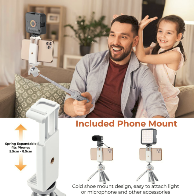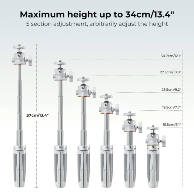 Výsuvný krk umožňuje nastavení výšky od 13 cm do 34 cm, což poskytuje větší tvůrčí flexibilitu pro vše od natáčení na stole až po zvýšené úhly selfie. Jeho vysoce kvalitní 360° kulový kloub s vertikálním nakloněním 90° zajišťuje plynulé a přesné nastavení úhlu, což usnadňuje přepínání mezi horizontálním a vertikálním režimem natáčení pro obsah sociálních médií.