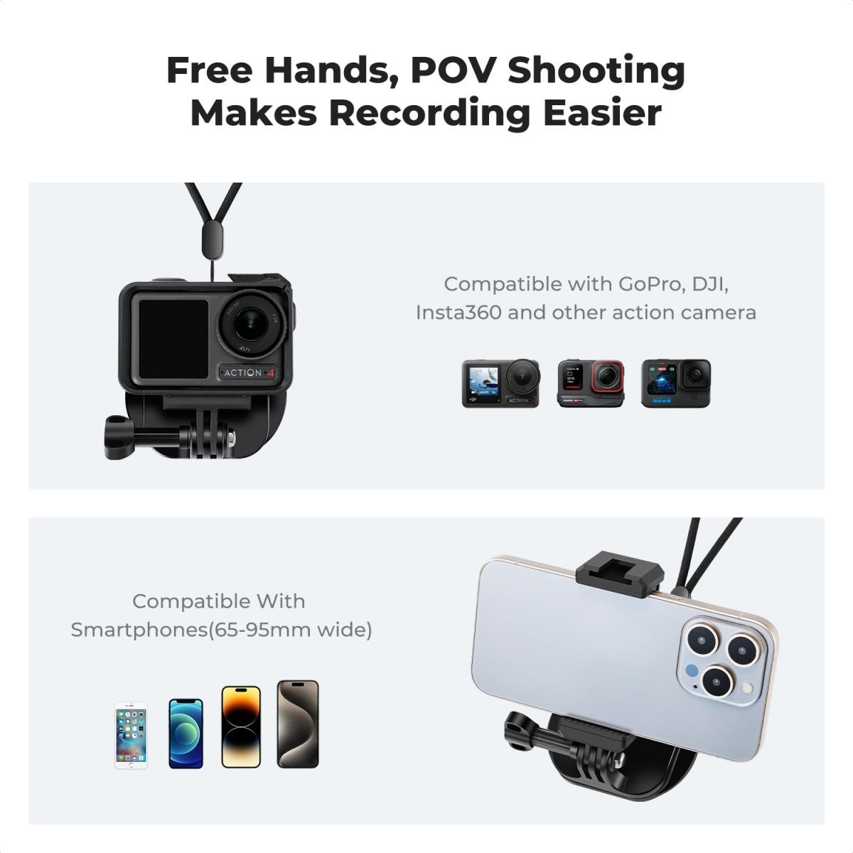K&F CONCEPT Neck Hanger je univerzální a kompaktní magnetický držák na hrudník určený pro plynulé natáčení bez použití rukou. Díky malému designu ve velikosti dlaně jej lze diskrétně schovat do oblečení, bundy nebo náprsní kapsy, takže je téměř neviditelný a zároveň se snadno přenáší a skladuje. Je vybaven výkonnými magnety N52 na předním panelu i základně, takže bezpečně drží vaše zařízení a chrání je během aktivity. Tento držák s dvojím použitím lze připevnit přímo na hladké kovové povrchy, jako jsou karoserie automobilů, ledničky nebo rámy stadionů, nebo použít přiloženou magnetickou fólii pro nekovové povrchy, jako je sklo, pracovní desky nebo středové konzole automobilů. Je široce kompatibilní s GoPro Hero 13/12/11/10/9/8/7/6/5 Black, DJI Osmo Action 5/4/3/2, Insta360 Ace/Ace Pro/Ace Pro 2 a dalšími akčními kamerami s konektorem typu „claw“ a je dodáván s držákem na mobilní telefony o šířce 65–95 mm, což z něj činí ideální volbu pro všestranné natáčení.