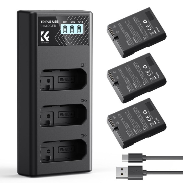 K&F Concept 3-Pack Nikon EN-EL14 baterie do fotoaparátu s 3-slotovou LCD nabíječkou. Obsahuje baterie EN-EL14 s kapacitou 1050 mAh a nabíječku s LCD displejem a duálním vstupem Micro USB/Type-C pro rychlé a bezpečné nabíjení.