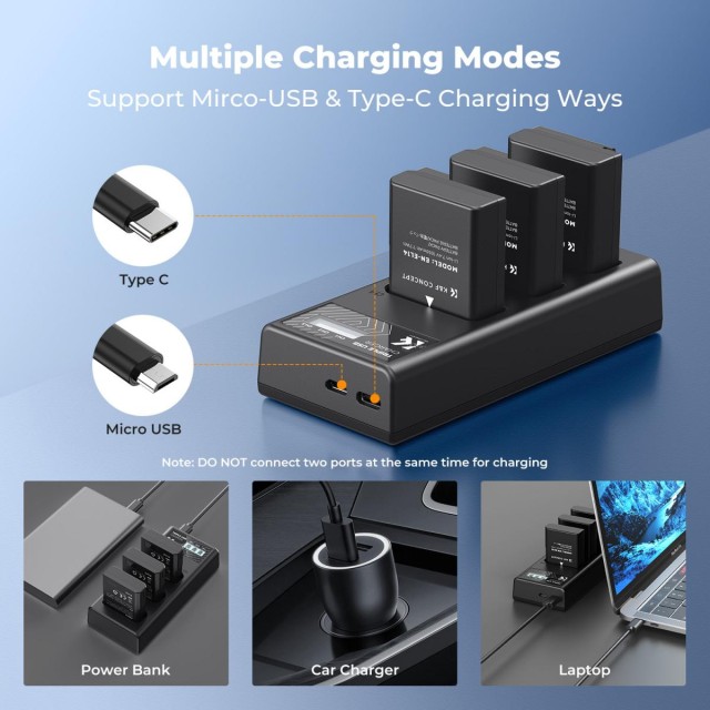 Sada obsahuje 3slotovou LCD nabíječku baterií, která umožňuje současné nabíjení tří baterií a zároveň zobrazuje stav nabíjení každé z nich na přehledném LCD displeji. Nabíječka podporuje duální vstup přes Micro USB nebo Type-C (5 V/2,1 A), díky čemuž je kompatibilní s nástěnnými adaptéry, autonabíječkami, notebooky a dalšími USB zdroji napájení. Při použití vstupu Type-C lze všechny tři baterie plně nabít přibližně za 3,8 hodiny.