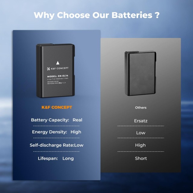 Sada baterií K&F Concept Nikon EN-EL14 obsahuje 3 vysokokapacitní baterie EN-EL14/EN-EL14a s kapacitou 1050 mAh a napětím 7,4 V, které poskytují dlouhou výdrž pro nepřetržité fotografování s fotoaparáty Nikon. Kompatibilní s modely včetně D5600, D5500, D5300, D5200, D5100, D3500, D3400, D3300, D3200, D3100, Coolpix P7000/P7100/P7200/P7700/P7800 a další zařízení napájená bateriemi EN-EL14.