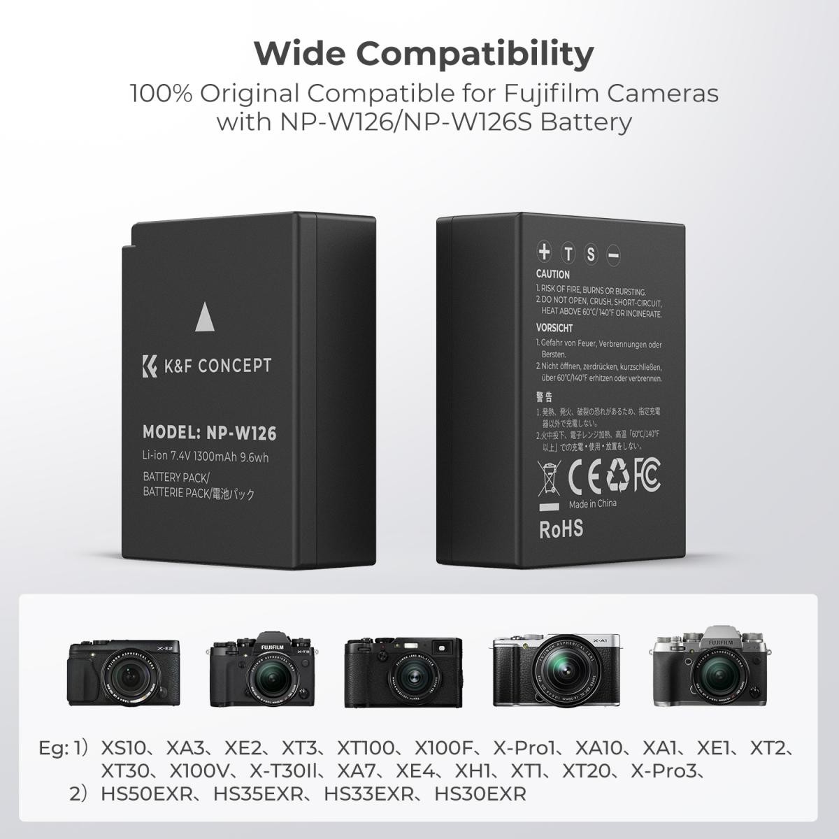 Sada K&F CONCEPT NP-W126 s dvojitou baterií a nabíječkou, určená pro fotografy a tvůrce obsahu, kteří vyžadují delší dobu fotografování, poskytuje praktické a efektivní řešení napájení pro vybrané fotoaparáty Fujifilm. Sada obsahuje dvě náhradní baterie NP-W126 s kapacitou 1300 mAh, které vám poskytnou dostatečnou záložní energii pro dlouhé fotografování bez přerušení.