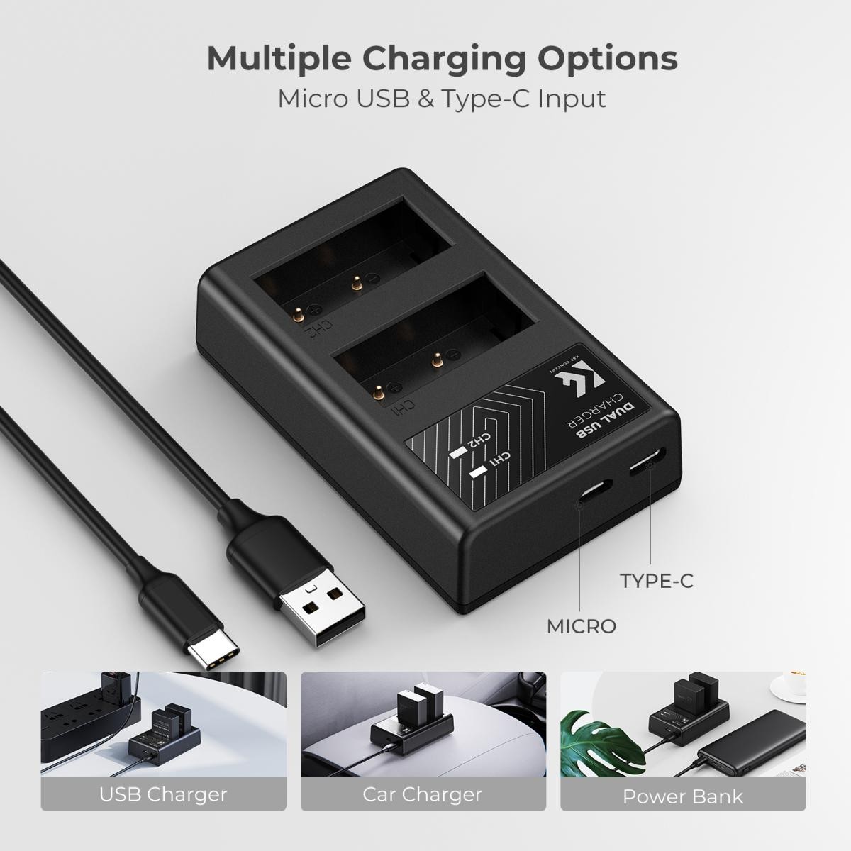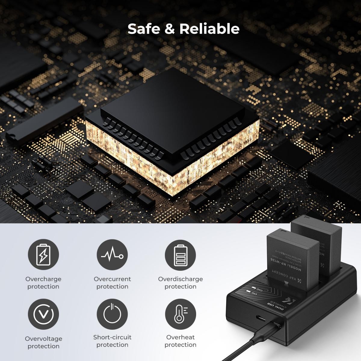 Sada dvou baterií K&F CONCEPT NP-W126 obsahuje dvě náhradní baterie s vysokou kapacitou 1300 mAh a nabíječku se dvěma sloty, která poskytuje spolehlivý a dlouhotrvající výkon pro kompatibilní fotoaparáty Fujifilm. Díky podpoře nabíjení přes Micro-USB a USB-C a vestavěným bezpečnostním ochranám je tato sada ideální pro fotografy, kteří potřebují flexibilní a spolehlivý zdroj energie na cestách.