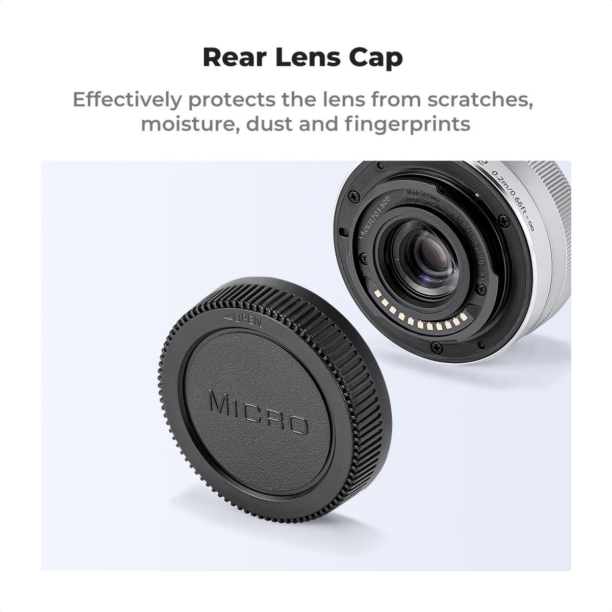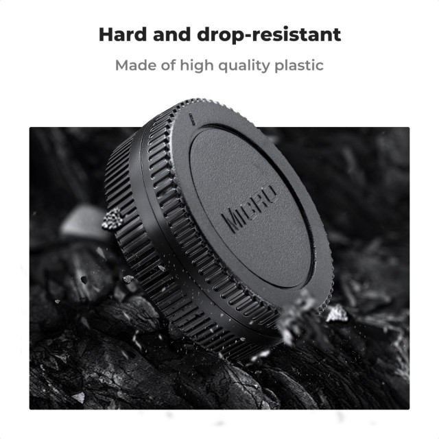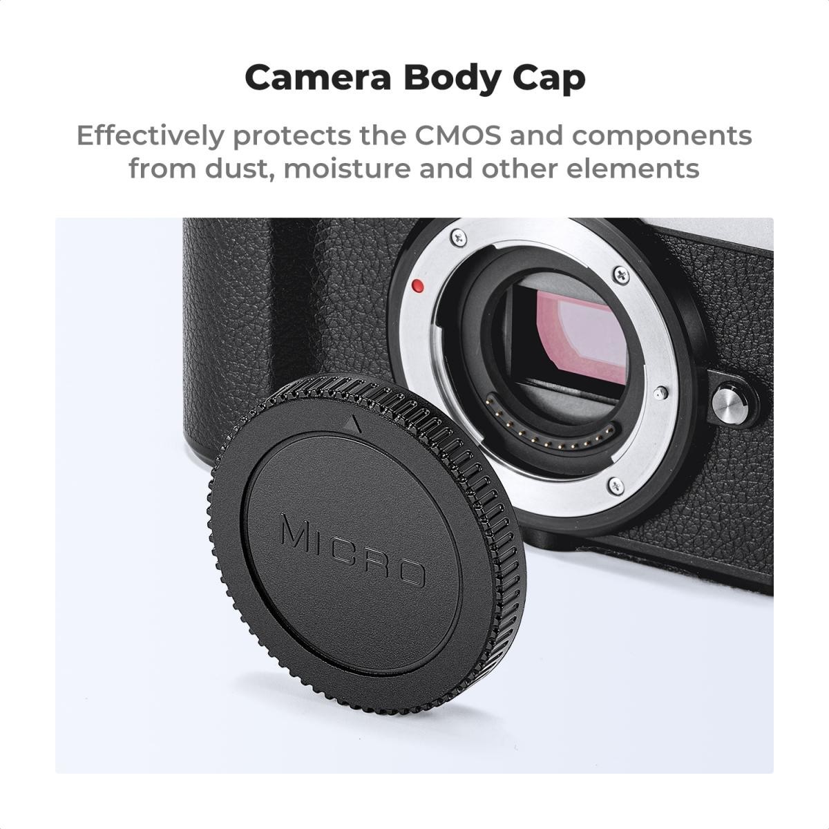 Ochranná sada K&F Concept Olympus M4/3: 2 krytky těla, 2 zadní krytky objektivu, 2 krytky horké patky + čisticí hadřík – odolný ABS, prachotěsný/vodotěsný, perfektně padne na fotoaparáty Olympus M4/3.