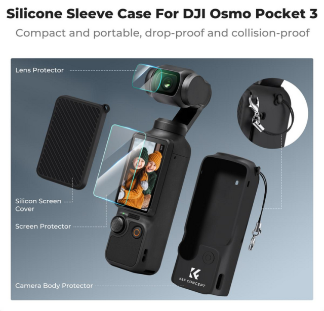Sada silikonových ochranných krytů K&F CONCEPT Pocket 3 je navržena pro optimální ochranu a funkčnost a obsahuje odolný silikonový kryt těla, nevýbušný ochranný kryt obrazovky z tvrzeného skla a praktické funkce proti ztrátě příslušenství fotoaparátu.