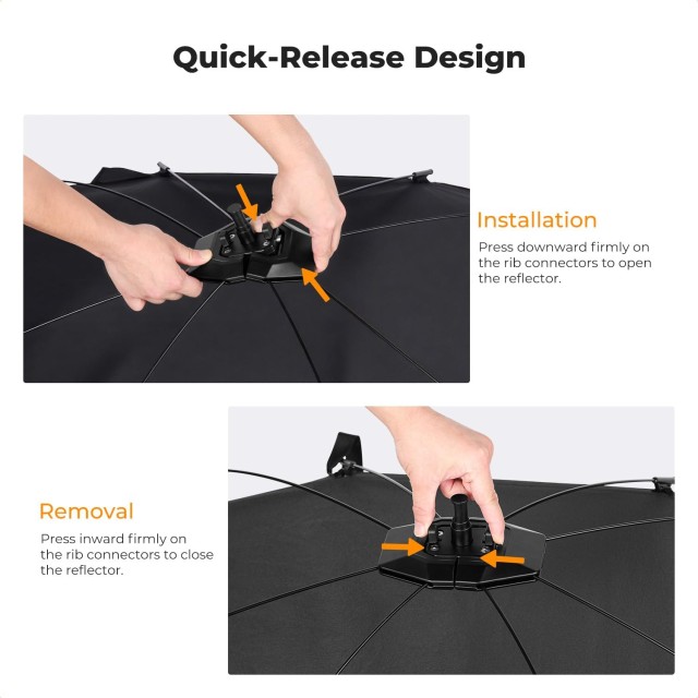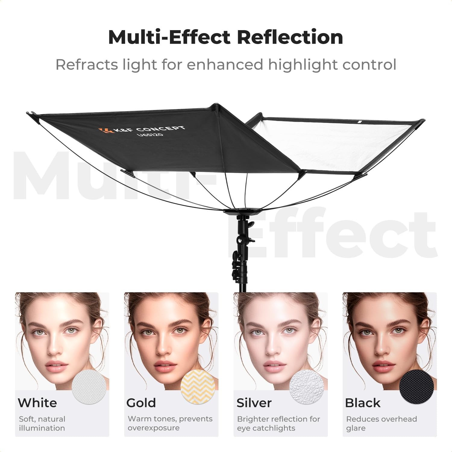K&F CONCEPT Quick-Release Curved Reflector-Two Moves to Soft Light je profesionální přenosné osvětlovací řešení pro fotografy, kteří hledají rychlé, univerzální a vysoce kvalitní ovládání světla. Váží pouhých 690 g (reflektor) a 1,5 kg (kompletní sada) a je dodáván s 1,5 m vysokým stojanem na světlo a pouzdrem se šňůrkou pro snadnou přepravu. Inovativní design s rychlým uvolňováním umožňuje nastavení ve dvou jednoduchých krocích – uvolněte popruh a stiskněte centrální hub, dokud nezacvakne – což šetří čas ve srovnání s tradičními reflektory. Jeho zakřivený povrch o rozměrech 123 × 65 cm rozptyluje světlo měkce kolem objektu, vylepšuje tóny pleti a vytváří krásné odlesky v očích. Nastavitelná základna o 180°, vybavená dlouhou rukojetí, umožňuje přesné nastavení úhlu bez použití nástrojů. Fotografové mohou pomocí magnetických krytů 4 v 1 okamžitě přepínat mezi černým, stříbrným, zlatým a bílým odrazovým povrchem, což jim nabízí maximální tvůrčí flexibilitu na místě. Ideální pro venkovní portréty, fotografování událostí a profesionální studiové sestavy.