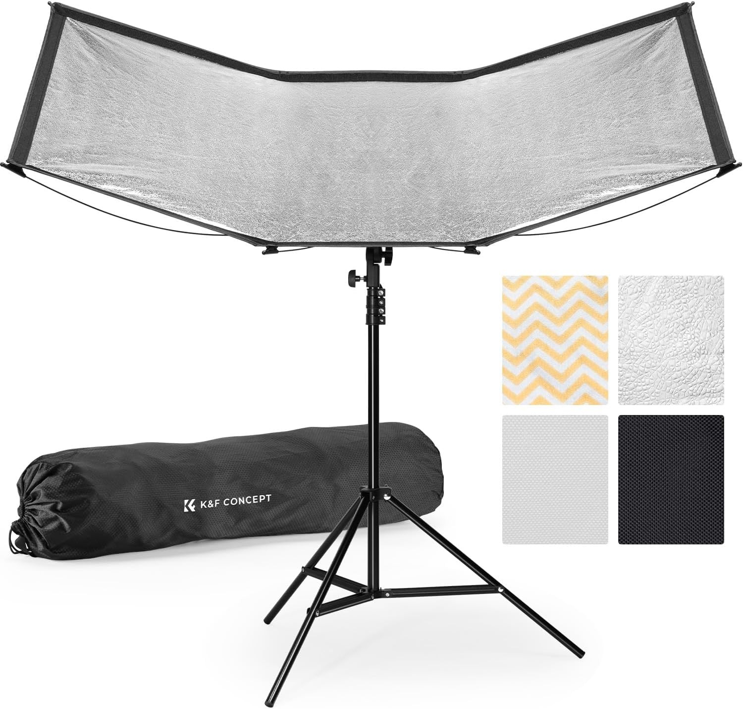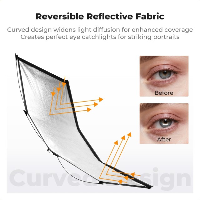 K&F CONCEPT Quick-Release Curved Reflector je lehký, přenosný reflektor o rozměrech 123 × 65 cm, který je navržen pro měkké, lichotivé světlo. Díky magnetickým krytům 4 v 1, základně nastavitelné v úhlu 180° a rychlému upevnění je ideální pro venkovní portréty, focení na lokacích a profesionální kvalitu odlesků v očích.
