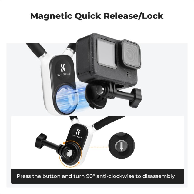 - * 【180° flexibilní nastavení úhlu a snadné použití】 Naklápěcí držák umožňuje nastavení až o 180°, zatímco 360° tyč J nastavuje úhel pro vertikální/horizontální snímání. Ideální pro vlogování, trekking nebo focení na cestách s dynamickými a kreativními úhly pohledu; Magnetický držák kamery umožňuje rychlé uvolnění nebo zajištění popruhu. Popruh lze bezpečně zajistit otočením o 90° ve směru hodinových ručiček. Pro odemčení stiskněte tlačítko rychlého uvolnění (šipka dolů) a otočte o 90° ve směru hodinových ručiček.