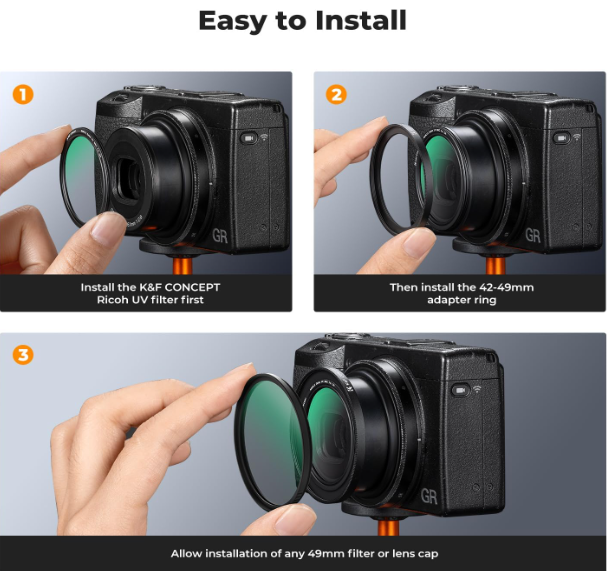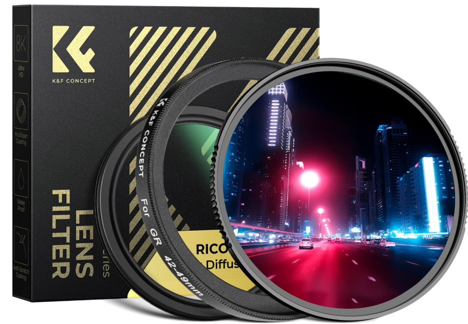 Sada filtrů K&F Concept Black Diffusion 1/4 + MCUV Protection Filter Kit s adaptérem 42–49 mm je speciálně navržená kombinace dvou filtrů pro kompaktní fotoaparáty Ricoh GR IIIx, GR IIIx HDF, GR III, GR III HDF a GR II, která kombinuje nezbytnou ochranu před UV zářením s filmovými efekty černého rozptylu. Vícevrstvý UV filtr blokuje ultrafialové paprsky, aby omezil modravé odstíny a chránil před prachem a škrábanci, zatímco difuzní filtr 1/4 zjemňuje nedokonalosti pleti, přidává snové odlesky a snižuje kontrast pro lichotivý, filmový lesk – to vše v ultratenkém 1,8mm rámečku z prémiového skla AGC, které zajišťuje vysokou propustnost bez vinětace.