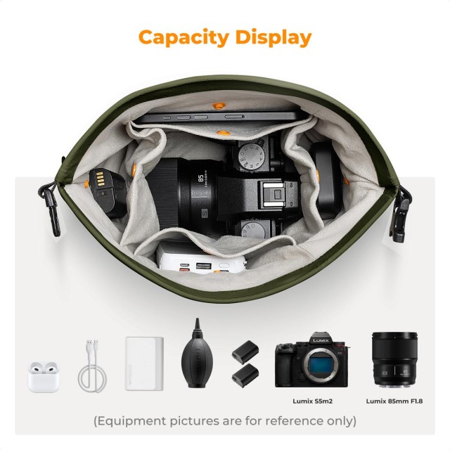Úložný prostor pro jeden fotoaparát a jeden objektiv. Lze použít jako tašku přes rameno, tašku přes tělo, kabelku nebo vnitřní tašku pro všestranné použití. Lehká a stylová taška s rolovacím uzávěrem. Kombinuje moderní design s bezpečným rolovacím uzávěrem pro větší ochranu.