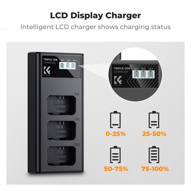 Ať už zachycujete okamžiky ve studiu, nebo na venkovní výpravě, nabíječka K&F Concept zajistí, že vaše baterie zůstanou nabité a připravené k použití.