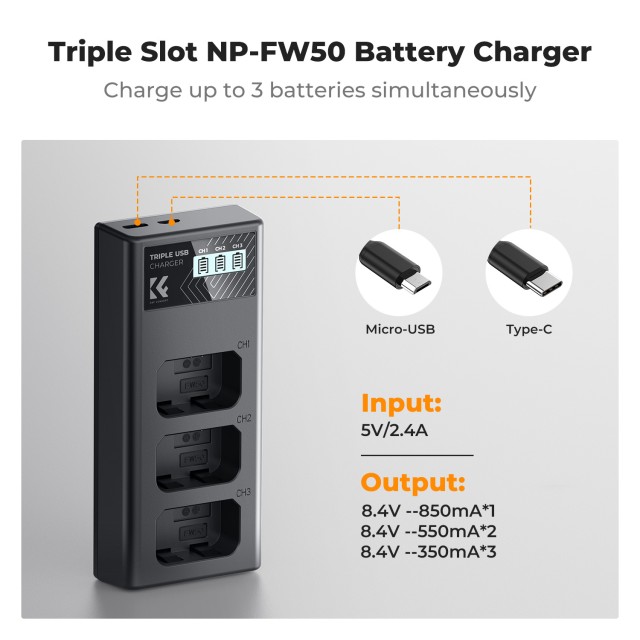 Bez námahy napájejte baterie Sony NP-FW50 pomocí nabíječky K&F Concept 3-Pack pro fotoaparáty. Tato nabíječka s trojitým nabíjením, inteligentním displejem LCD a univerzálními možnostmi nabíjení přes USB nebo Type-C zajistí, že vaše baterie budou vždy připraveny k akci.