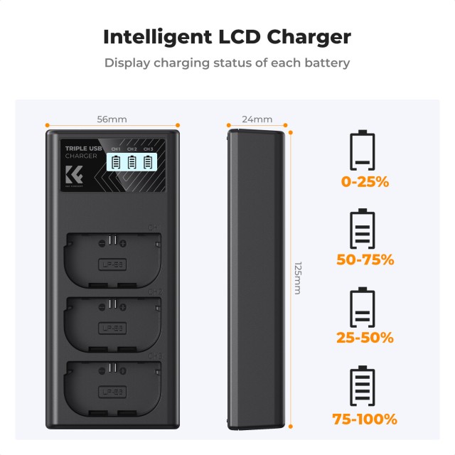 Nabíječka K&F Concept Sony NP-FZ100 3-Pack s LCD displejem je dokonalým řešením nabíjení pro fotografy, kteří vyžadují spolehlivost a pohodlí. Tato kompaktní nabíječka je navržena pro nabíjení až tří baterií Sony NP-FZ100 současně a je ideální pro použití ve studiu i na cestách.