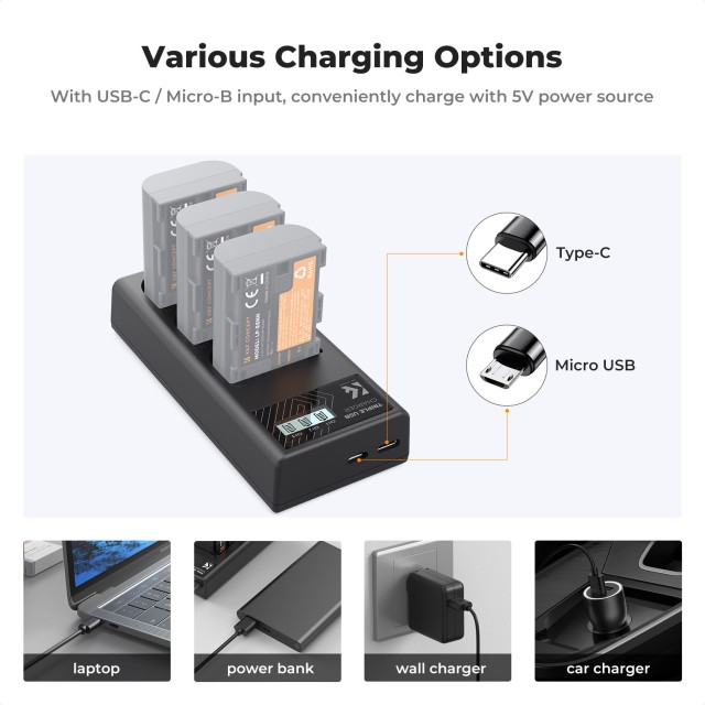 Nabíjejte baterie Sony NP-FZ100 efektivně pomocí nabíječky K&F Concept 3-Pack. Nabíječka se třemi sloty, inteligentním displejem LCD a univerzálními možnostmi nabíjení přes USB a Type-C vám zajistí, že budete mít vždy dostatek energie na další fotografování.