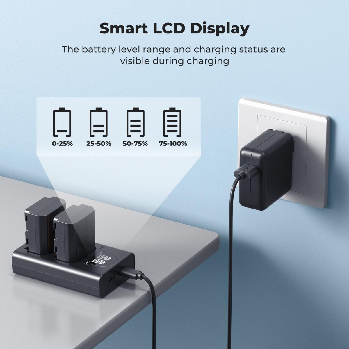 Součástí sady je nabíječka s dvěma sloty a LCD displejem, která umožňuje nabíjet dvě baterie NP-FZ100 současně. LCD displej zobrazuje stav nabíjení každé baterie v reálném čase, což usnadňuje sledování stavu nabití.
