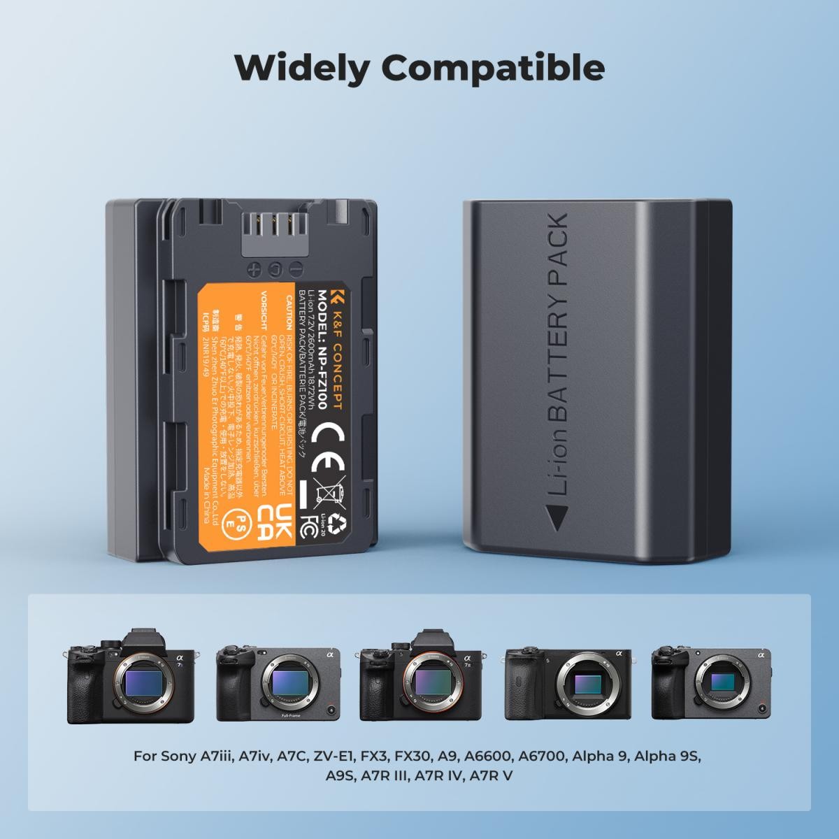 Sada baterií K&F Concept Sony NP-FZ100 obsahuje dvě vysokokapacitní baterie 2600 mAh, které poskytují delší výdrž pro nepřerušované fotografování. Tyto baterie jsou určeny pro profesionální fotografy a nadšence a jsou plně kompatibilní s fotoaparáty Sony A7III, A7IV, A7C, ZV-E1, FX3, FX30, A9, A6600, A6700, Alpha 9/9S, A7R III/IV/V. Poskytují spolehlivý výkon s plným dekódováním baterie.