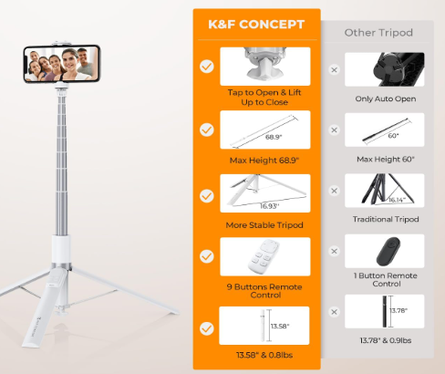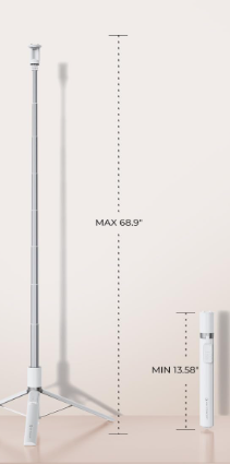 K&F Concept Aluminium Selfie Stick X96 70-inch je univerzální, lehký (0,8 lb/376 g) stativ z hliníkové slitiny s inovativním magnetickým přísavným systémem pro automatické otevírání/zavírání, který umožňuje snadné ovládání jednou rukou. Jeho délka se dá nastavit od 13,6 do 68,9 palců, což zaručuje stabilní širokoúhlé snímky. Díky 360° horizontálnímu a 180° vertikálnímu otáčení ve dvou osách, 9tlačítkovému dobíjecímu Bluetooth dálkovému ovladači pro fotografování, zoom, přepínání fotoaparátů a ovládání videa a univerzální kompatibilitě s telefony o šířce 2,17–3,35 palce a studené patce pro mikrofony/světla je to dokonalý přenosný společník pro cestovní vlogy, živé přenosy a rodinné fotografie.