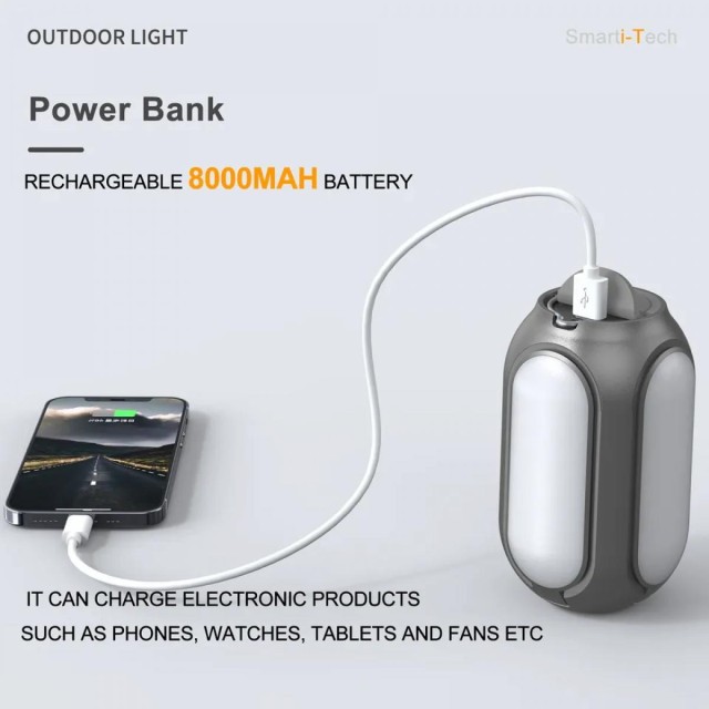 * Lze použít jako mobilní zdroj energie: toto kempinkové světlo má vestavěnou vysokokapacitní baterii s kapacitou 8000 mAh a výstupním portem USB DC 5V 2A pro rychlé nabíjení mobilního telefonu, iPhonu, tabletu a dalších zařízení prostřednictvím nabíjecího kabelu USB během turistiky nebo kempování.