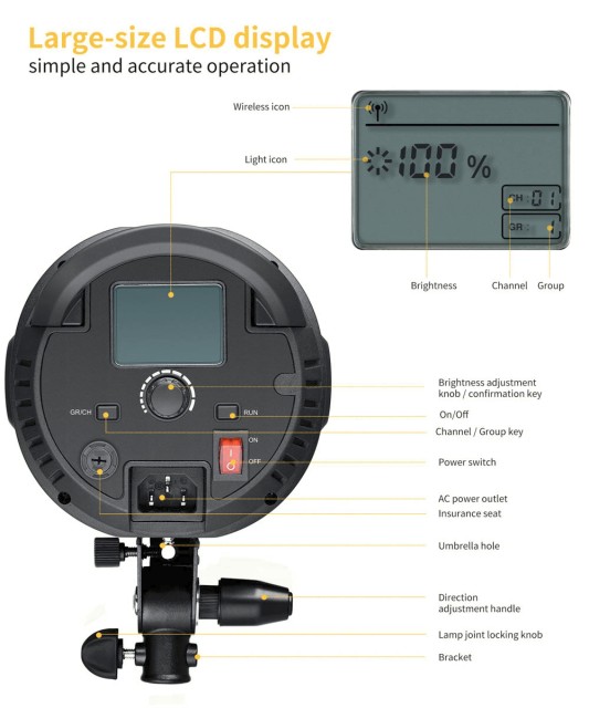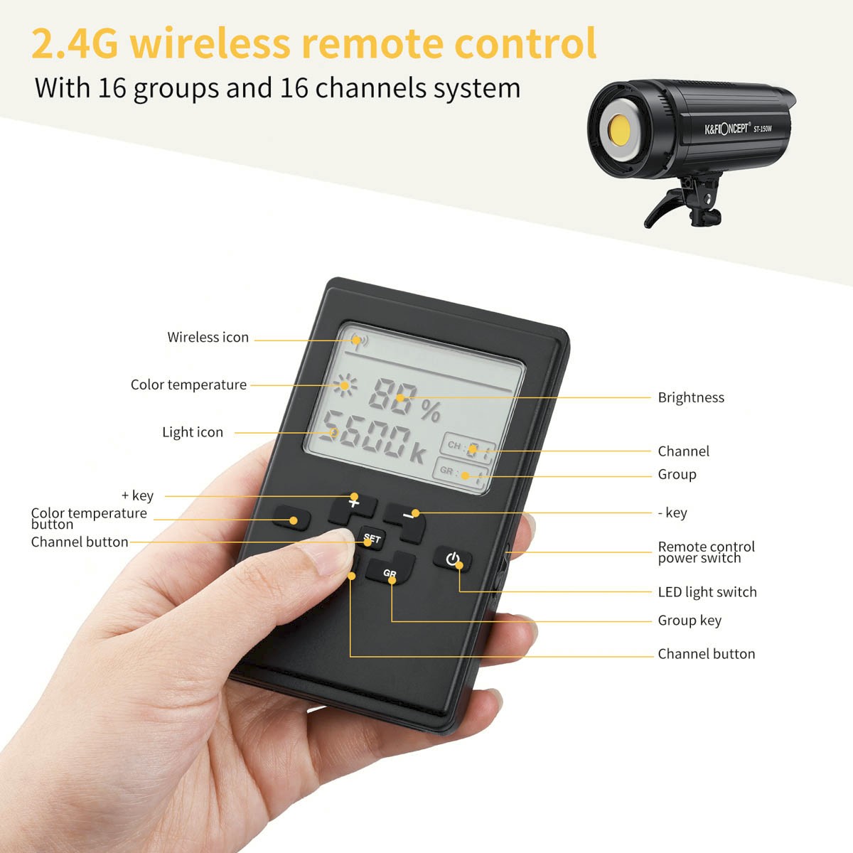 S CRI 95 a TLCI 95+ zajišťuje ST-150W přirozené tóny pleti a přesnou reprodukci barev. Jas lze plynule nastavit od 10 % do 100 % pomocí zadního ovladače nebo přiloženého bezdrátového dálkového ovladače. Velký, přehledný LCD displej zobrazuje procentuální jas, kanál a nastavení skupiny, což umožňuje seskupit a ovládat více světel současně.