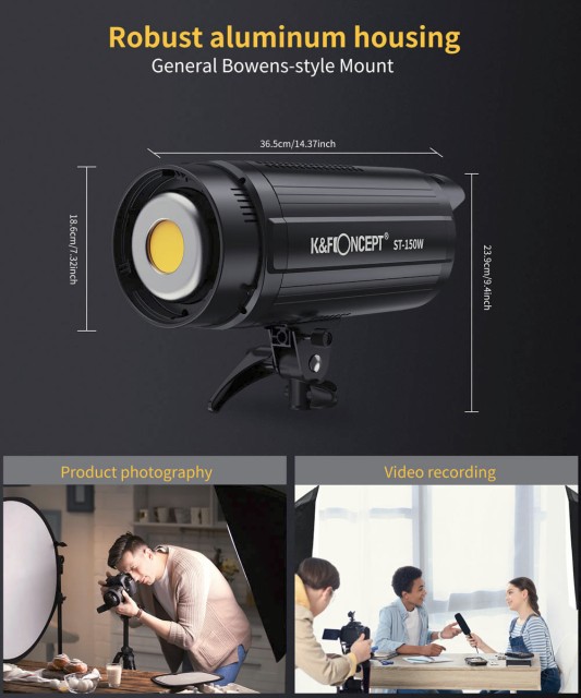 Světlo je vyrobeno z pevného hliníkového pouzdra a je vybaveno účinným systémem odvodu tepla s prémiovým chladičem a ultra tichým chladicím ventilátorem, který zajišťuje dlouhodobou stabilitu bez rušení zvukového záznamu. Oblíbený držák Bowens zajišťuje širokou kompatibilitu se softboxy a modifikátory, zatímco přiložený reflektor a slot pro deštník umožňují flexibilní tvarování světla. Díky robustní konstrukci, možnosti dálkového ovládání a univerzálnímu držáku na stativ je K&F ST-150W spolehlivým osvětlovacím nástrojem pro použití ve studiu i v terénu.