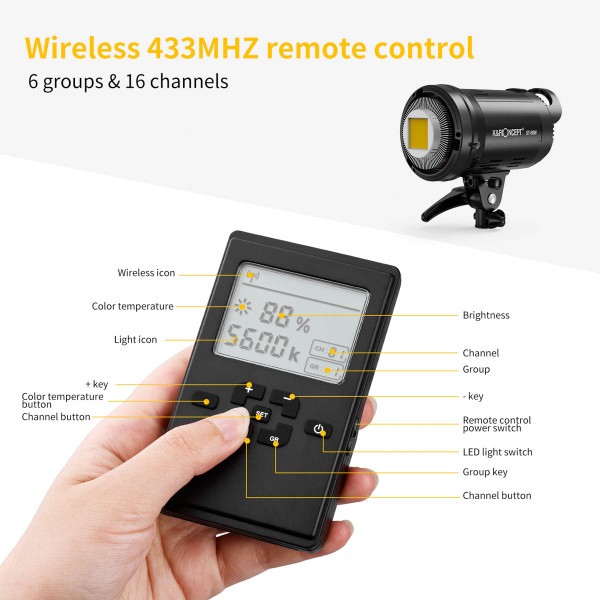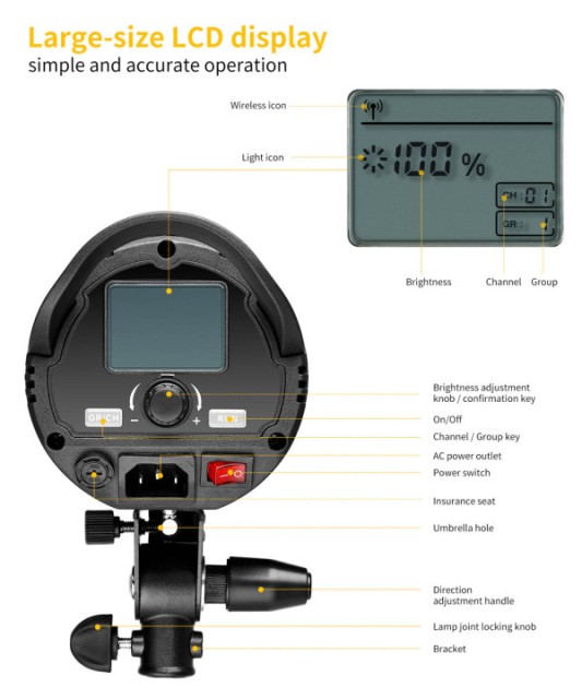Jas lze plynule nastavit od 10 % do 100 % pomocí vestavěného stmívače nebo přiloženého bezdrátového dálkového ovladače. Čistý zadní LCD displej zobrazuje procentuální jas, kanál a informace o skupině, což umožňuje seskupit a ovládat více světel současně. Konstrukce s úchytem Bowens podporuje širokou škálu softboxů a modifikátorů, zatímco přiložený reflektor a slot pro deštník poskytují flexibilní možnosti tvarování světla.