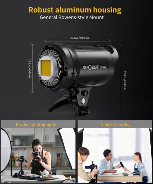 K&F ST-60W Continuous LED Steady Light je kompaktní, lehká denní COB LED svítilna určená pro rozhovory, vlogování a fotografování. Nabízí přesné podání barev, kompatibilitu s držáky Bowens a bezdrátové dálkové ovládání a poskytuje profesionální osvětlení v vysoce přenosném provedení.