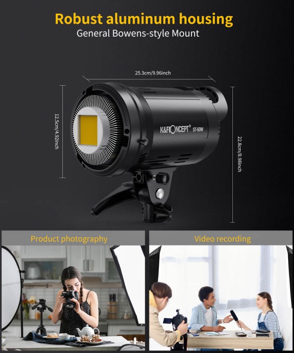 ST-60W je umístěn v odolném těle z hliníkové slitiny a je vybaven účinným systémem odvodu tepla s tichým chladicím ventilátorem, díky čemuž je vhodný pro prostředí citlivá na hluk. Jeho kompaktní velikost, lehká konstrukce a spolehlivý výkon z něj činí vynikající volbu pro tvůrce, kteří potřebují profesionální osvětlení na cestách.