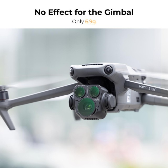 Ultralehký plastový rámeček váží přibližně 6,9 g a byl důkladně testován, aby bylo zajištěno, že neovlivňuje výkon stabilizátoru Mavic 3 Pro. Přesný bajonetový úchyt s přesným umístěním zadní spony umožňuje rychlou a bezpečnou instalaci a demontáž a perfektně sedí na základnu objektivu dronu. Povrch filtru je zčernalý, aby se dále minimalizovaly vnitřní odrazy a zachovala optimální kvalita obrazu.