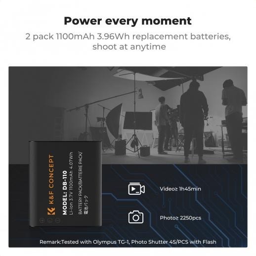 Plně dekódovací baterie, kompatibilní s fotoaparáty Ricoh GR III, GR III HDF, GR IIIx HDF,GR IIIX, WG-6 používajícími baterie modelu DB-110, kompatibilní také s fotoaparáty Olympus TG7/6/5/4 používajícími baterie Li-90B/Li-92B.