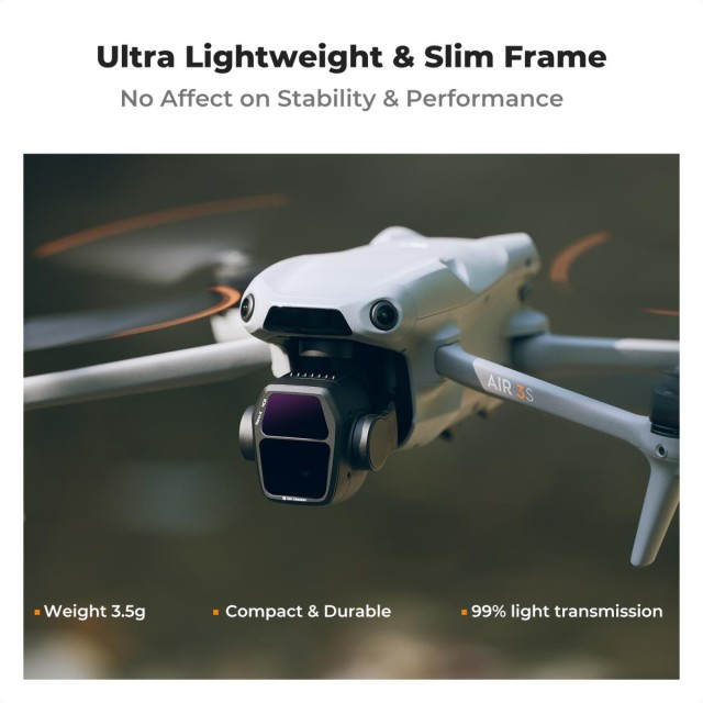 Sada ND filtrů K&F Concept speciálně navržená pro systém duálních kamer DJI Air 3S, sada filtrů ND8, ND16, ND32 a ND64 pomáhá snížit různé úrovně světla od 3 do 6 stupňů, přesně ovládat rychlost závěrky, správně kontrolovat expozici v různých světelných podmínkách a vytvářet plynulé záběry. Tento filtr K&F Concept Air 3S je vyroben ze špičkového optického skla AGC s 28vrstvými multifunkčními nanometrickými vrstvami na obou stranách, které pomáhají zachytit živé barvy a získat působivé záběry, vrstvy chrání filtry proti opotřebení a poškrábání, prachu, půdě a odpuzují vodu.
