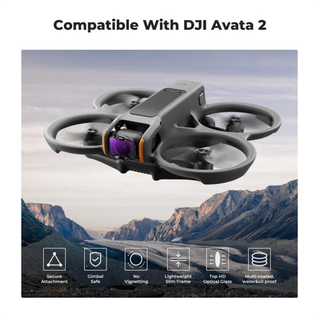 Tato nejnovější sada 4 balení ND filtrů od společnosti K&F Concept je speciálně navržena pro DJI Avata 2 a obsahuje ND8, ND16, ND32 a ND64. Vyznačuje se ultralehkou hmotností, zajišťuje bezpečnost gimbalu vašeho dronu a je vyroben ze špičkového optického skla, které pomáhá reprodukovat nekompromisní snímky, a je cenným doplňkem vaší sady nástrojů pro droneshot.