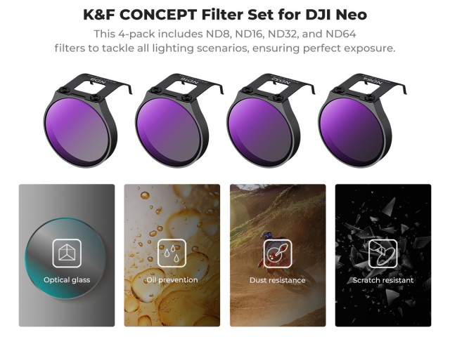 Sada filtrů K&F DJI NEO 4ks poskytuje základní ND a polarizační filtry pro zlepšení expozice, snížení odlesků a zlepšení barev pro fotografování s dronem DJI NEO, s odolnou, vodotěsnou a proti poškrábání odolnou konstrukcí pro kvalitní snímky v jakýchkoli podmínkách.
