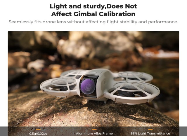 Každý filtr je vyroben z vícevrstvého optického skla HD s povrchovou úpravou, která obnovuje věrné barvy, odpuzuje vodu, odolává poškrábání a snadno se čistí. Velmi lehký rám z hliníkové slitiny zajišťuje bezpečné uchycení bez zvýšení hmotnosti, takže filtry zůstávají stabilní i při rychlých manévrech. Součástí balení je kompaktní úložné pouzdro a čisticí hadřík pro pohodlné skladování a údržbu, což z této sady činí vynikající příslušenství pro profesionální i amatérské fotografy z dronů.