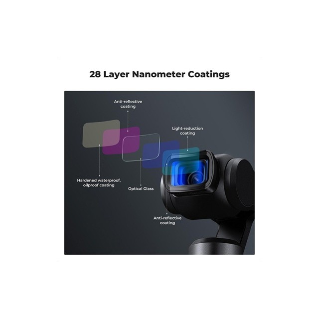 • 28 vícevrstvých povlaků: Přijatá vícevrstvá povrchová úprava, která pomáhá odpuzovat vodu, prach, mastnotu a zabraňuje poškrábání. Snadno se čistí a udržuje a chrání objektiv Osmo Pocket 3 před vším možným. Černý nátěr přizpůsobený povrchu rámu filtru pro minimalizaci odrazů a snížení dopadu na obraz.