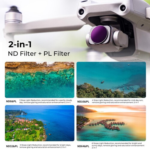 Vylepšete své letecké fotografie a videozáznamy pomocí sady filtrů K&F Concept ND/PL pro DJI Air 2S. Tato sada čtyř filtrů obsahuje filtry ND8/PL, ND16/PL, ND32/PL a ND64/PL, z nichž každý kombinuje výhody neutrálního filtru s kruhovým polarizačním filtrem. Funkce CPL odstraňuje odlesky a odrazy a zároveň zlepšuje sytost barev, zatímco komponenta ND redukuje světlo o 2–6 stupňů, což vám umožní zachytit plynulé rozmazání pohybu a správně exponované záběry za jasného slunečního světla nebo částečně zatažené oblohy.