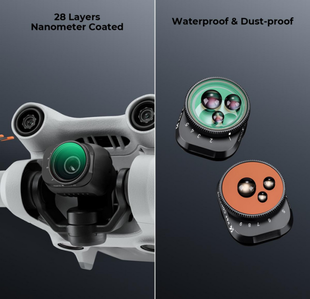 Sada variabilních ND filtrů K&F pro DJI Mini 3 Pro a Mini 3 obsahuje nastavitelné filtry ND2-ND32 a ND32-ND512, které umožňují přesnou kontrolu expozice bez barevného posunu. Tyto filtry jsou vyrobeny z vysoce kvalitního optického skla AGC s 28 vrstvami nanopovlaku a nabízejí snížení odrazů, vodotěsnost, odolnost proti poškrábání a ochranu proti plísním…