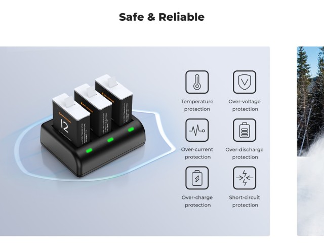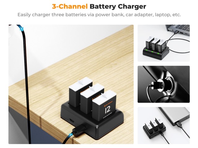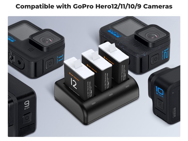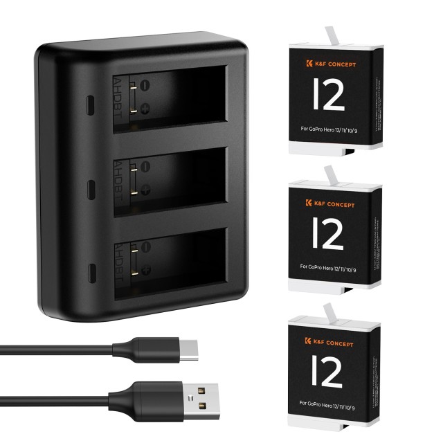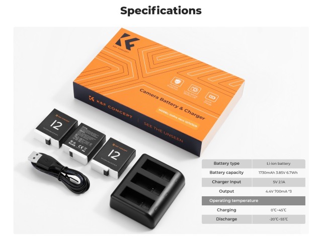 K&F Concept Hero 12 Battery 3-Pack 1730mAh Enduro Batteries with 3-Slot Charger Kompatibilní s kamerami GoPro Hero 12, GoPro Hero 11, GoPro Hero 10, GoPro Hero 9 Black. Originální standard. 3-pack 1730mAh enduro baterií přijal vysoce kvalitní bateriové články, použití originálního standardu, jmenovité napětí 3,85 V, 1730 mAh, skutečná kapacita, žádný paměťový efekt baterie.