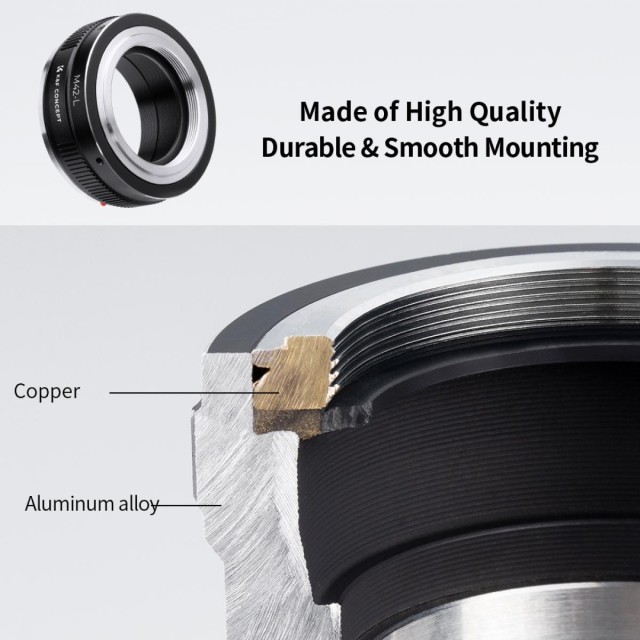 Vysoce přesný adaptér objektivu K&F (M42-L) umožňuje používat objektivy se závitem M42 na fotoaparátech s bajonetem L a nabízí spolehlivou přesnost a kompatibilitu při manuálním ostření.