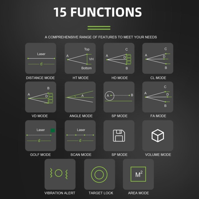 * 15 funkcí a automatické ukládání dat: měření vzdálenosti, měření výšky dvou bodů, horizontální vzdálenost, nejbližší vzdálenost, vertikální výška, měření rychlosti, měření objemu a mnoho dalších 15 užitečných měření s komplexní škálou funkcí, které uspokojí vaše různé potřeby. Režim použitý před vypnutím se po vypnutí zaznamená a zůstane v režimu použitém před dalším zapnutím, aniž byste jej museli znovu nastavovat.