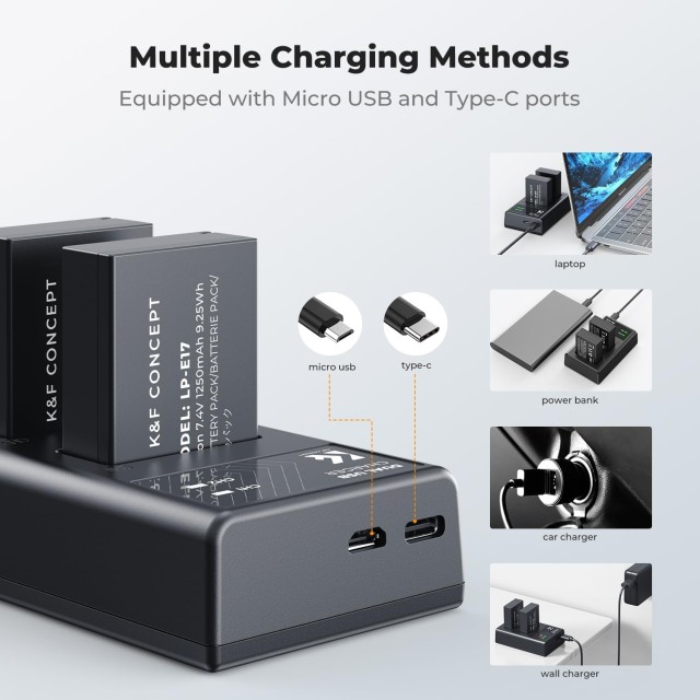 Sada baterií a nabíječky K&F Concept LP-E17 je navržena tak, aby vaše fotoaparáty Canon vydržely déle v provozu, což je ideální pro delší fotografování nebo nahrávání videa. Tato sada obsahuje dvě dobíjecí baterie s kapacitou 1250 mAh, které fungují stejně jako originální baterie a zajišťují stabilní a spolehlivé napájení. Nabíječka se dvěma sloty podporuje vstupy USB-C i Micro B, což umožňuje flexibilní nabíjení ze síťových adaptérů, notebooků nebo powerbank, s možností nabíjet dvě baterie současně nebo samostatně. Tato kompaktní a přenosná sada nabíječky a baterií je ideální pro fotografy na cestách. Balení obsahuje 2 baterie LP-E17, 1 nabíječku s dvěma sloty a 1 nabíjecí kabel USB-C, takže máte vše, co potřebujete k napájení. Kompatibilní s fotoaparáty Canon EOS R50, R10, Rebel T6/T6i/T6s a dalšími fotoaparáty kompatibilními s LP-E17 (poznámka: u některých modelů se nemusí zobrazovat výdrž baterie).