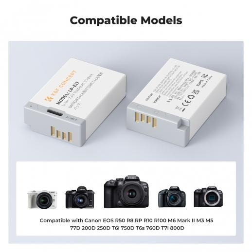 výkonná baterie s kapacitou 1040 mAh. Baterie K&F Concept 2-Pack LP-E17 poskytují dlouhotrvající energii pro delší fotografování. Plně dekódovaná náhradní baterie. Tato baterie LP-E17 je široce kompatibilní s digitálními zrcadlovkami Canon EOS R10, EOS M6 Mark II, Rebel SL2, T6i, T6s, T7i, EOS 200D 750D 760D 77D, 800D 8000D KISS X8i. Je plně dekódovaná a na fotoaparátu se neobjevuje žádné vyskakovací upozornění.