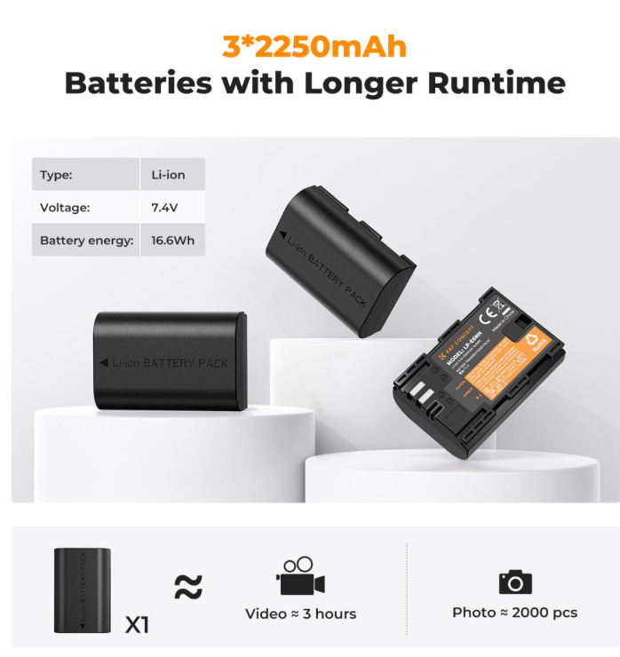 Sada obsahuje tři vysokokapacitní lithium-iontové baterie s kapacitou 2250 mAh, z nichž každá poskytuje napětí 7,4 V a energii 16,6 Wh, což zajišťuje delší dobu snímání a snižuje potřebu časté výměny baterií během dlouhých focení. Tyto baterie jsou navrženy jako spolehlivá náhrada za typy baterií LP-E6, LP-E6N a LP-E6NH.