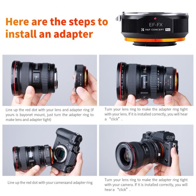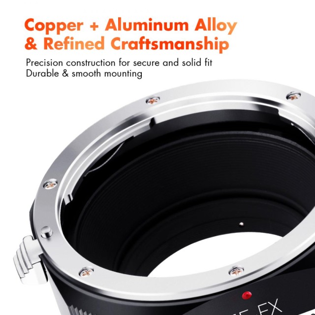 Adaptér K&F Concept M12115 New Design High Precision Lens Mount umožňuje používat objektivy Canon EF a EF-S na tělech bezzrcadlovek Fuji s bajonetem FX, jako jsou X-Pro1, X-T1 nebo X-E2. Tento adaptér je vyroben z robustní celokovové konstrukce a opatřen tvrzenou eloxovanou povrchovou úpravou, takže je trvanlivý a odolný proti opotřebení. Podporuje manuální ostření, ruční ovládání clony a ostření na nekonečno, což fotografům poskytuje plnou tvůrčí kontrolu. Vnitřní povrchová úprava s matným povrchem pomáhá snižovat vnitřní odrazy, zatímco jasně vyznačený červený zarovnávací bod umožňuje rychlé a snadné nasazení objektivu.
