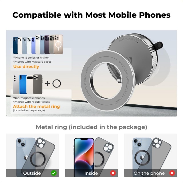 Držák váží pouhých 125 g a po složení má rozměry ⌀58 mm × 40 mm, takže je extrémně přenosný a vhodný na cestování. Je navržen především pro iPhony s MagSafe, ale díky přiloženým kovovým kroužkům, které se připevňují na zadní stranu zařízení pro magnetické uchycení, je vhodný i pro jiné modely telefonů. Díky kombinaci bezpečnosti, nastavitelnosti a přenosnosti je ideální pro řízení, streamování nebo použití na stole.