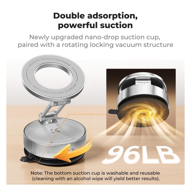 Magnetický držák telefonu do auta K&F CONCEPT (stříbrný) je univerzální, o 360° otočný držák s vakuovým přísavným uchycením a silnými dvojitými kroužky s magnety N52. Je kompaktní, skládací a kompatibilní s iPhony MagSafe nebo jakýmkoli telefonem pomocí přiložených kovových kroužků. Zajišťuje bezpečné uchycení na hladkých površích a palubních deskách a nabízí přesné nastavení v několika osách.