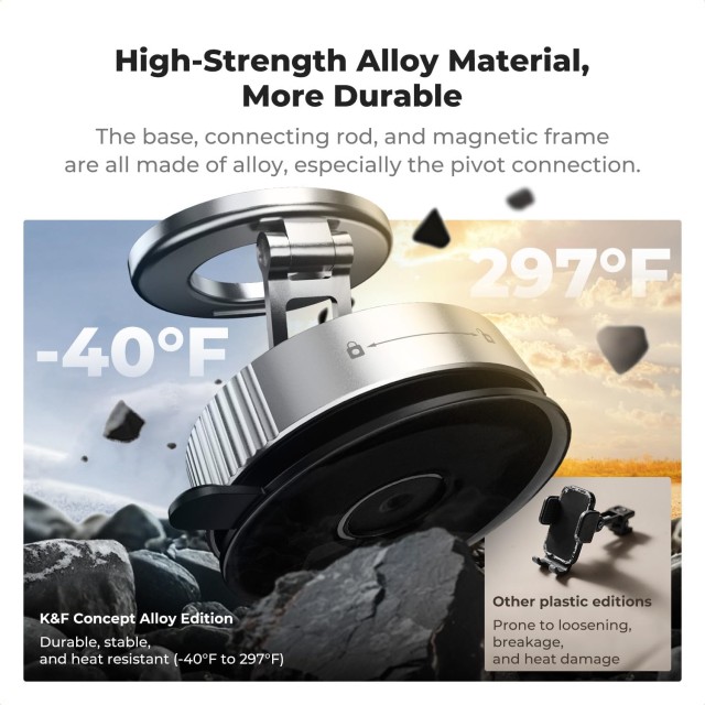 Magnetický držák na telefon do auta K&F CONCEPT (stříbrný) kombinuje silný magnetismus, spolehlivou přilnavost a tříosou nastavitelnost, čímž vytváří bezpečný a univerzální držák na telefon pro řízení, práci nebo domácí použití. Jeho magnetický design s dvojitým prstencem a 20 vysoce pevnými magnety N52 zajišťuje bezpečné uchycení telefonů i během jízdy po nerovném povrchu. Přísavná základna je vybavena nano-gelovým designem, který umožňuje opakované připevnění a čištění bez ztráty přilnavosti a funguje v extrémních teplotách od -104 °F do 298 °F (-40 °C až 148 °C).