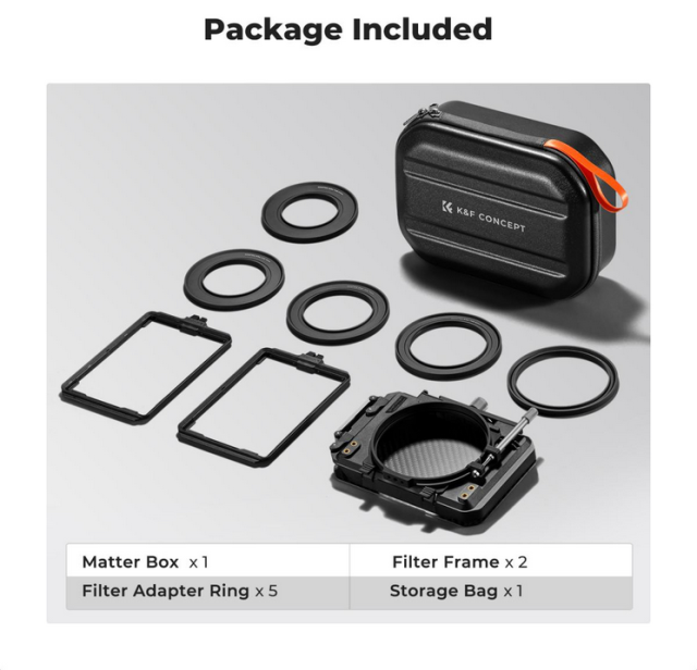 Sada K&F Matte Box Kit obsahuje 5 adaptérových kroužků a 2 rámečky filtrů vyrobené z lehkých uhlíkových vláken, které zajišťují vynikající kontrolu světla a kompatibilitu s různými objektivy.