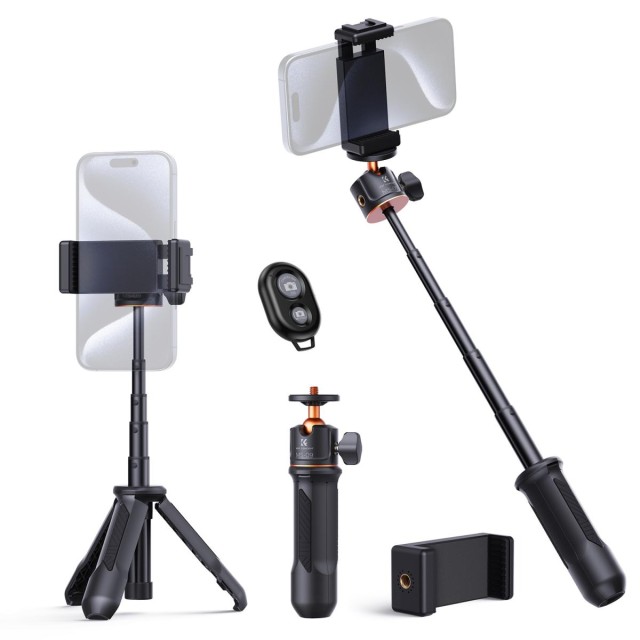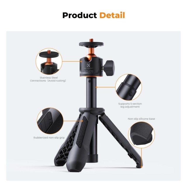 Stativ pro mobilní telefony MS02 /34cm stativ pro mobilní telefony s dálkovým ovládáním, černý a oranžový. Maximální výška dosahuje 34 cm a podporuje 5stupňové nastavení nohou, takže můžete libovolně nastavit požadovanou výšku. Tato stativová hlava podporuje nosnost 2 kg a je vhodná pro potřeby většiny bezzrcadlovek, stativů pro mobilní telefony s dálkovým ovládáním a dalších zařízení.